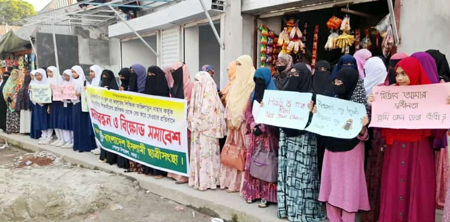 ভিকারুননিসা নূন স্কুল এন্ড কলেজের শিক্ষিকা ফজিলাতুন নাহার কর্তৃক হিজাব পরিহিত শিক্ষার্থীদের শ্রেণিকক্ষ থেকে বের করে দেওয়ার প্রতিবাদে বগুড়ার শেরপুরে